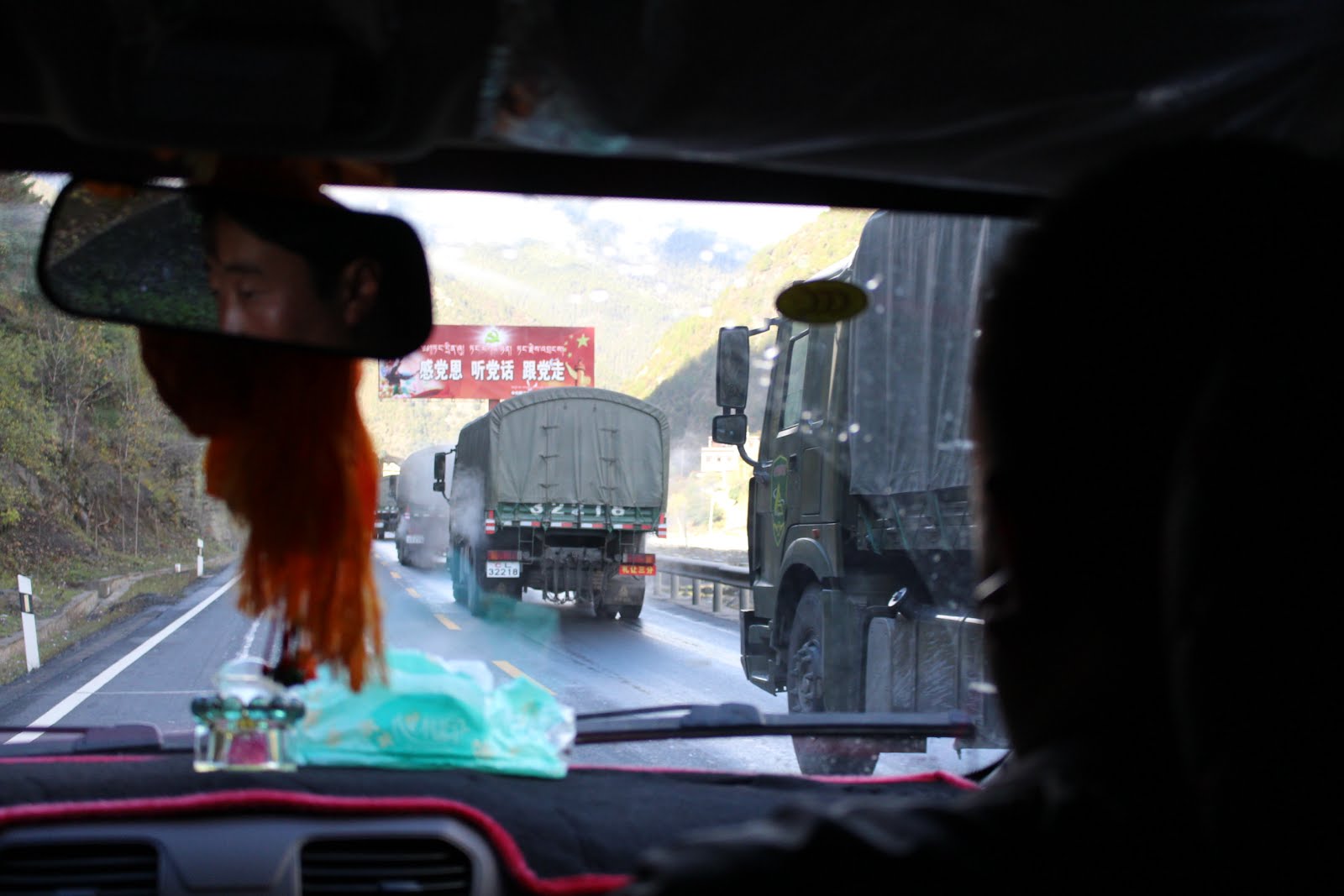 通過長5682公尺的高爾寺隧道(真的超長的@@),另一頭天氣非常好,可是很不巧地,我們遇到了近百台的軍車,加上喬丹師傅的超車技術很爛,所以車行速度變得非~常~慢。一開始不知道這些軍車是做什麼用的,數量實在太驚人了,還以為是哪裡又發生了什麼暴動是要去鎮壓的(抖),後來查了一下,才知道這批奇路鐵騎團是專門在川藏線上運送物資的軍隊,是說當這個兵也太辛苦了吧,在這條線上除了高山症要應付外,還有冬天的暴風雪等惡劣氣候,據說川藏線上平均每一公里都埋著一位軍人的魂魄啊。